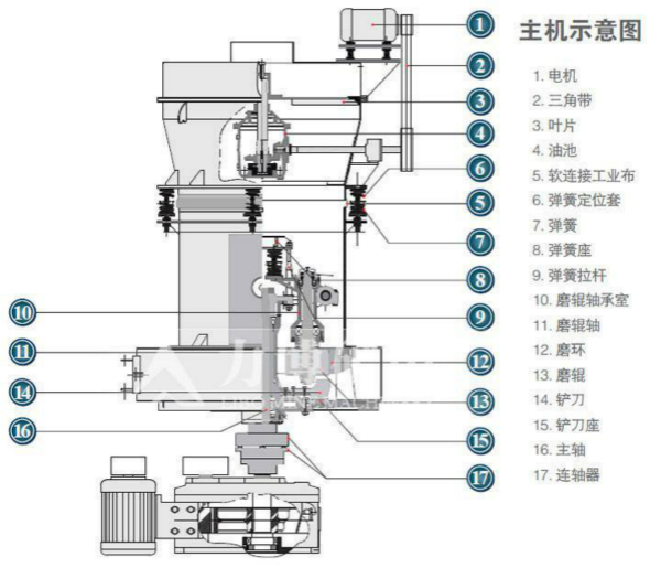 开始工作后,磨辊围绕主轴旋转,并在高压弹簧与离心力的作用下,紧贴