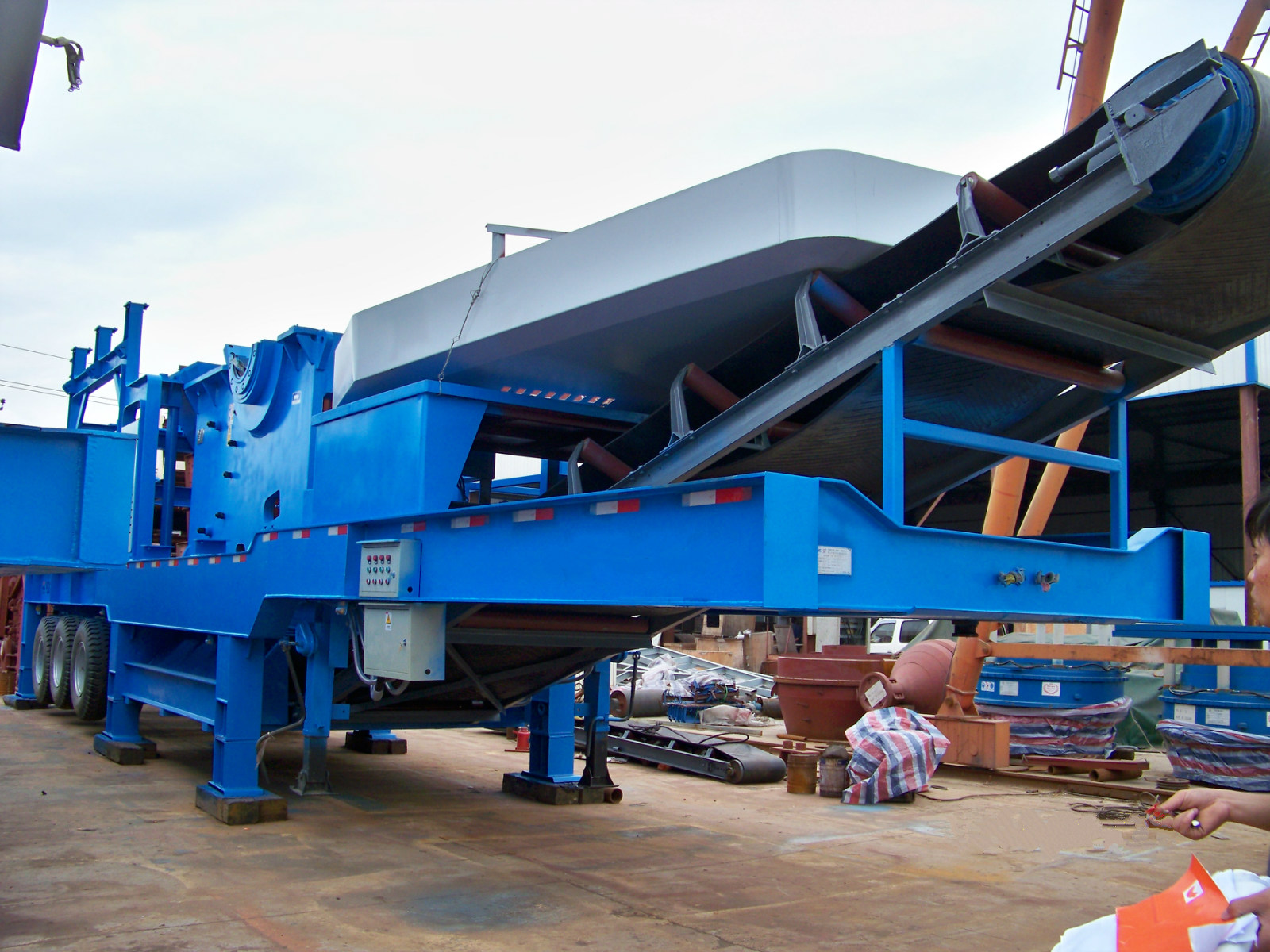 移动破碎站所有部件完全机载,包括:牢固的机架、破碎机、给料机、振动筛、传送带、电动机和控制箱等。 物料经给料机均匀输送到破碎机内(根据需要可为颚式破碎机、反击式破碎机、圆锥破碎机或冲击式破碎机等),初步破碎后,通过圆振动筛构成闭路系统,实现物料的循环破碎,成品物料由输送机输出,进行连续破碎作业。颚式移动破碎机可以根据实际生产需要去除圆振动筛,实现对物料直接进行初步破碎,与其他破碎设备配套使用操作方便、灵活。